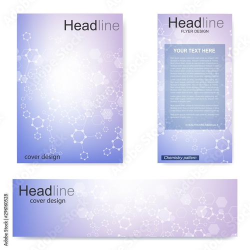 Set flyer, brochure size A4 template,banner. Molecular structure with connected lines and dots. Scientific pattern atom DNA with elements for magazine, leaflet, cover, poster design.