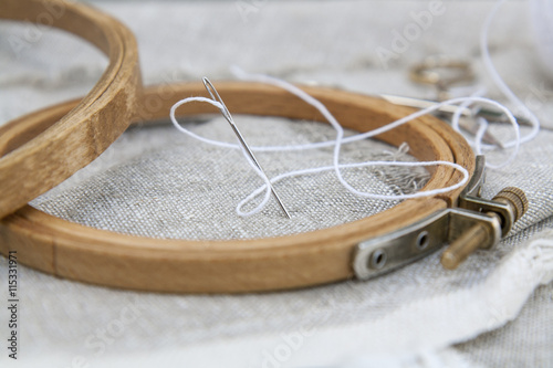 Set for embroidery, garment needle and embroidery hoop on unbleached linen fabric. Selective focus on needle. Shallow depth of field