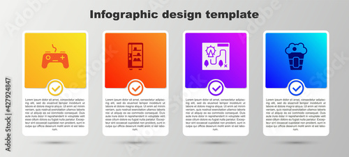 Set Gamepad, Vending machine, Amusement park map and Popcorn box. Business infographic template. Vector