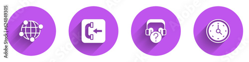 Set Global technology, Incoming call phone, Headphones with question and Clock icon with long shadow. Vector