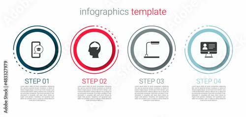 Set Graduation cap on mobile, Human brain, Table lamp and Online class. Business infographic template. Vector
