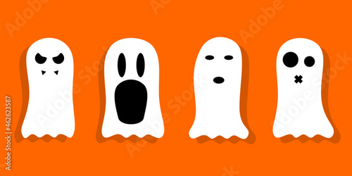 Set Halloween cute little white ghost spooky with face character on orange background flat vector design.