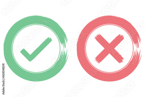 Set hand drawn check mark, tick and cross brush signs, checkmark OK and X icons, symbols YES and NO button, sketch checkmarks. Check mark, tick and cross brush signs, green check mark OK and red X no