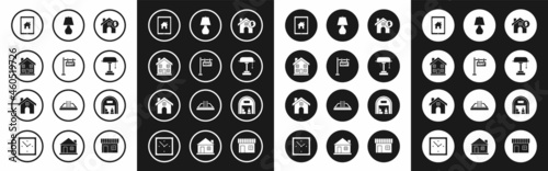 Set House with dollar symbol, Hanging sign text Rent, Home, Tablet and smart home, lamp, Warehouse and icon. Vector