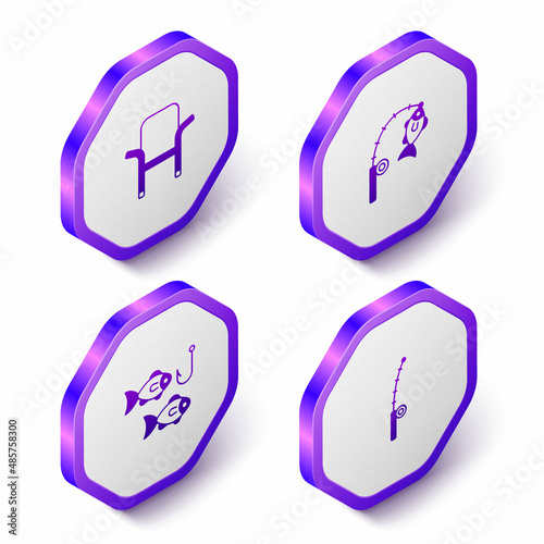 Set Isometric Camping folding chair, Fishing rod and fish, hook with and icon. Purple hexagon button. Vector
