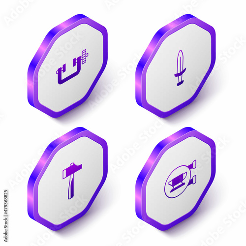 Set Isometric Clamp and screw tool, Medieval sword, Hammer and Blacksmith anvil icon. Purple hexagon button. Vector