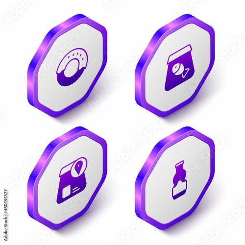 Set Isometric Donut, Online ordering fish, food and Sauce bottle icon. Purple hexagon button. Vector