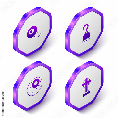 Set Isometric Eye, Pirate hook, and Tombstone with cross icon. Purple hexagon button. Vector