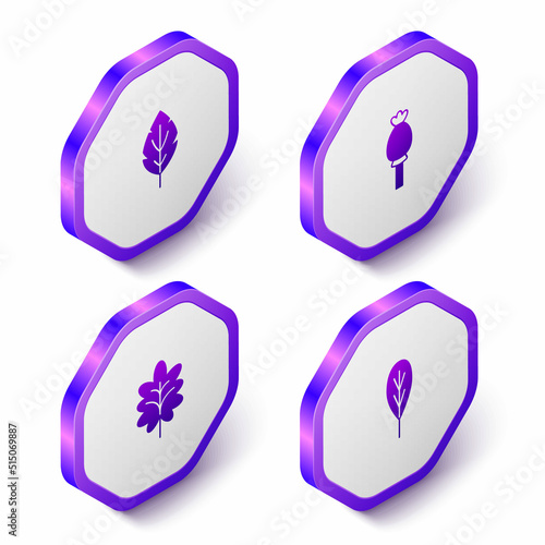 Set Isometric Leaf, Opium poppy, and icon. Purple hexagon button. Vector