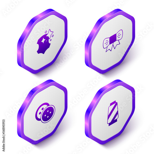 Set Isometric Leather, Gift bow, Sewing button for clothes and thread spool icon. Purple hexagon button. Vector