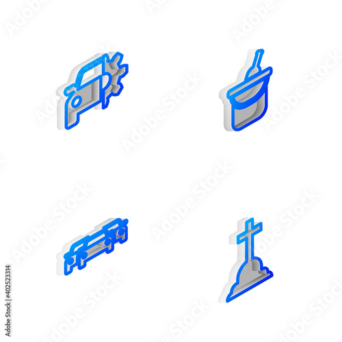 Set Isometric line Bottle of wine in bucket, Car service, Cars and Tombstone with cross icon. Vector.