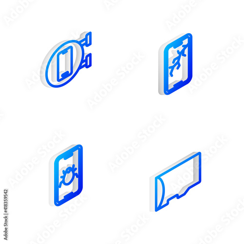 Set Isometric line Mobile with broken screen, Phone repair service, System bug mobile and Micro SD memory card icon. Vector.