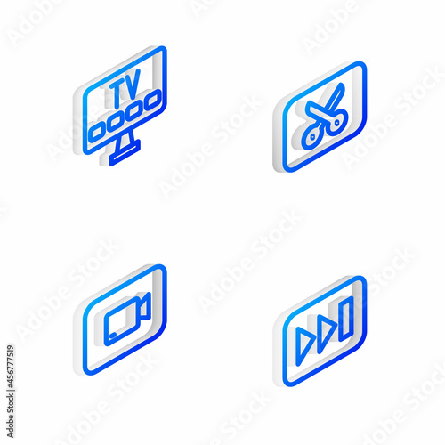Set Isometric line Music or video editing, Smart Tv, Play button and Fast forward icon. Vector