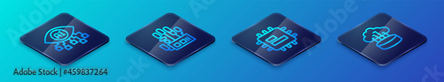Set Isometric line Processor CPU, Computer vision, Network cloud connection and Mechanical robot hand icon. Vector