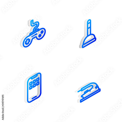Set Isometric line Rubber plunger, Gamepad, Mobile Apps and Electric iron icon. Vector