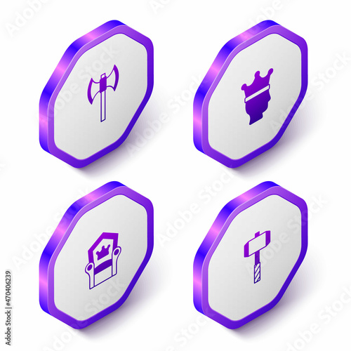 Set Isometric Medieval poleaxe, King crown, throne and Battle hammer icon. Purple hexagon button. Vector