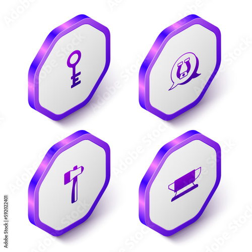 Set Isometric Old key, Horseshoe, Hammer and Blacksmith anvil tool icon. Purple hexagon button. Vector