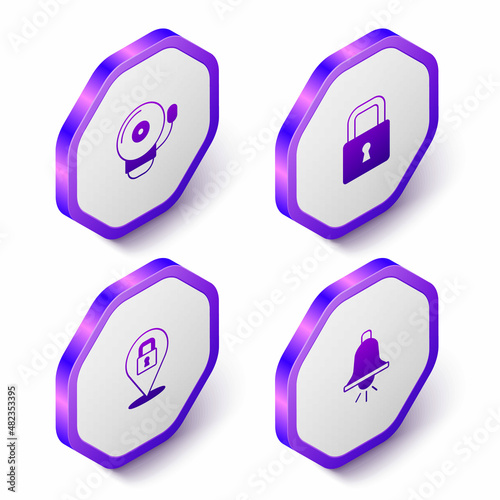 Set Isometric Ringing alarm bell, Lock, and icon. Purple hexagon button. Vector