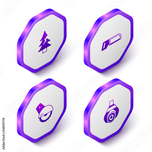 Set Isometric Tree, Hacksaw, Electric circular and Grapple crane grabbed log icon. Purple hexagon button. Vector