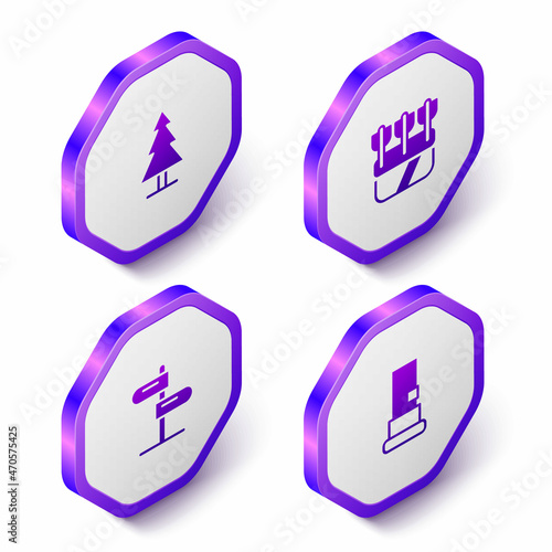 Set Isometric Tree, Quiver with arrows, Road traffic sign and Cartridges icon. Purple hexagon button. Vector