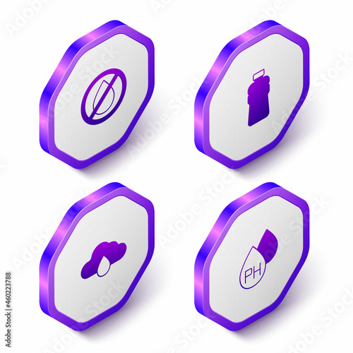Set Isometric Water drop forbidden, Bottle of water, Cloud with rain and icon. Purple hexagon button. Vector