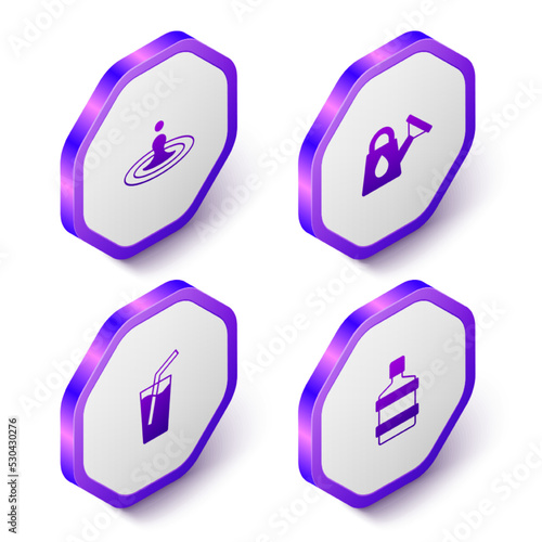 Set Isometric Water drop, Watering can, Glass with water and Big bottle clean icon. Purple hexagon button. Vector