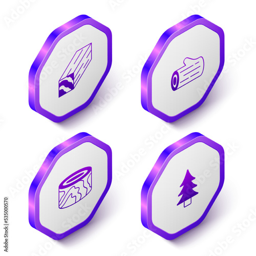 Set Isometric Wooden beam, log, logs and Tree icon. Purple hexagon button. Vector