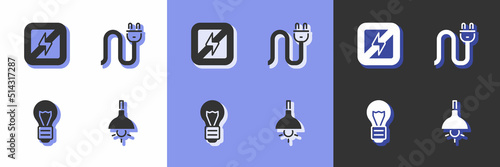 Set Lamp hanging, No lightning, Creative lamp idea and Electric plug icon. Vector