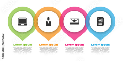 Set Laptop, Employee, Stacks paper money cash and FAQ information. Business infographic template. Vector