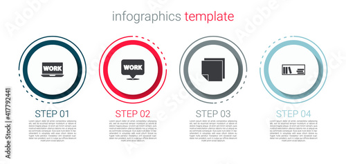 Set Laptop with text work, Location, Post note stickers and Shelf books. Business infographic template. Vector.
