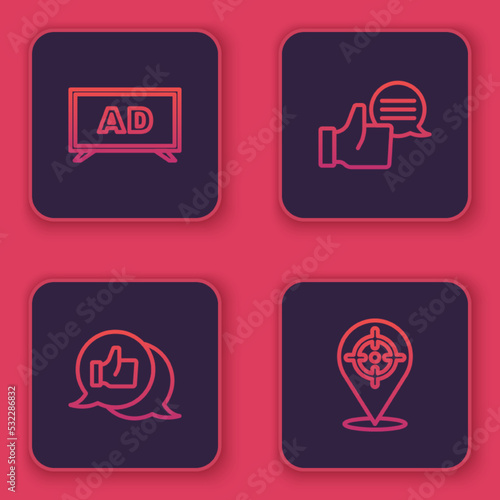 Set line Advertising, Customer product rating, and Target. Blue square button. Vector