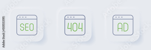 Set line Advertising, Page with a 404 error and SEO optimization icon. Vector