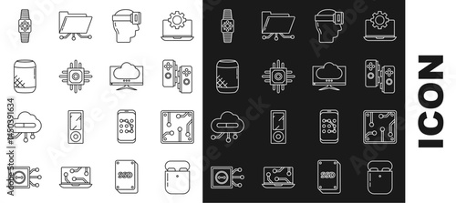 Set line Air headphones in box, Processor, Gamepad, Virtual reality glasses, Voice assistant, Smartwatch and Computer monitor screen icon. Vector