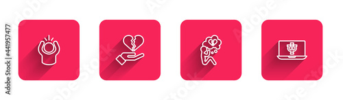 Set line Anger, Broken heart or divorce, and Psychologist online with long shadow. Red square button. Vector