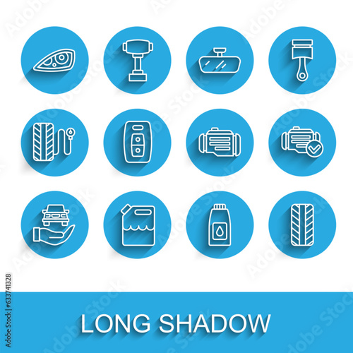 Set line Auto service check automotive, Canister for gasoline, Car headlight, motor machine oil, tire wheel, key with remote, Check engine and icon. Vector