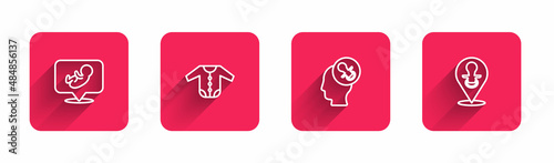 Set line Baby, clothes, dummy pacifier and with long shadow. Red square button. Vector