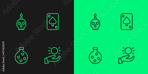 Set line Ball levitating above hand, Bottle with potion, Burning candle skull and Playing cards icon. Vector