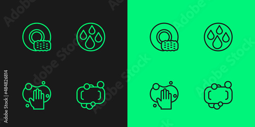 Set line Bar of soap, Sponge, Washing dishes and Water drop icon. Vector