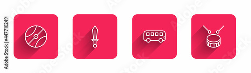 Set line Basketball ball, Sword toy, Bus and Drum with drum sticks with long shadow. Red square button. Vector