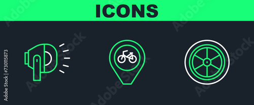 Set line Bicycle wheel, head lamp and Location with bicycle icon. Vector