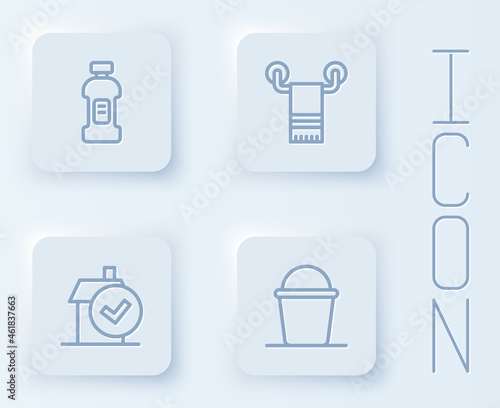 Set line Bottle for detergent, Towel on hanger, Home cleaning service and Bucket. White square button. Vector