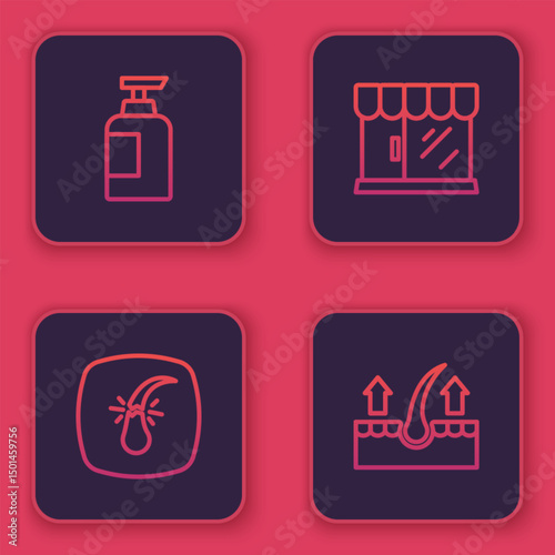 Set line Bottle of shampoo, Broken hair follicle, Barbershop building and Human. Blue square button. Vector