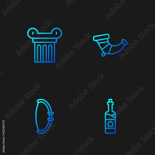 Set line Bottle of wine, Medieval bow, Ancient column and Hunting horn. Gradient color icons. Vector