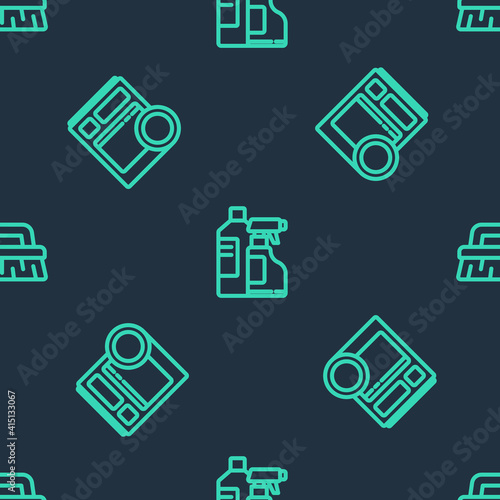 Set line Bottles for cleaning agent, Kitchen dishwasher machine and Brush on seamless pattern. Vector.