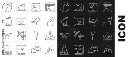 Set line Breaking news, Interview, Journalist, World, Live stream, Cinema camera, Create account and War journalist icon. Vector