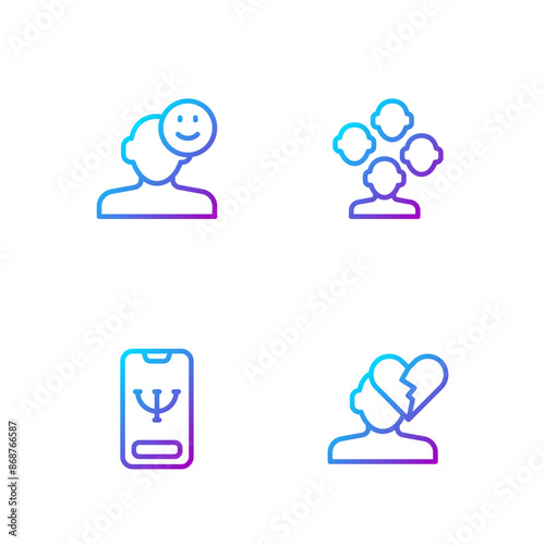 Set line Broken heart or divorce, Online psychological counseling, Good mood and Schizophrenia. Gradient color icons. Vector