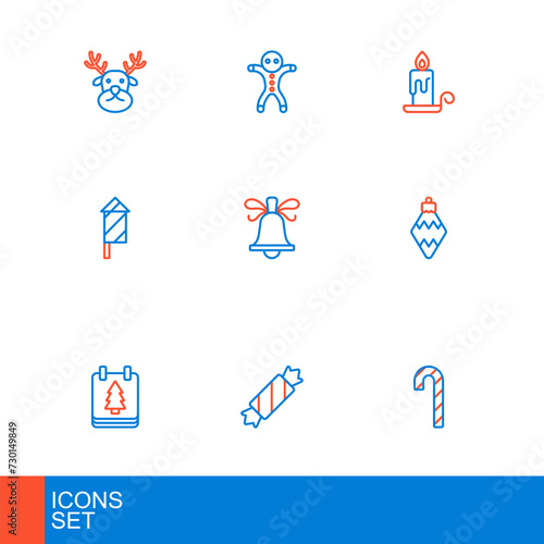 Set line Candy cane with stripes, Christmas day calendar, toy, Firework rocket, ringing bell, Burning candle and Holiday gingerbread man cookie icon. Vector