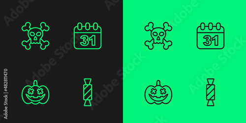 Set line Candy, Pumpkin, Skull on crossbones and Halloween date 31 october icon. Vector