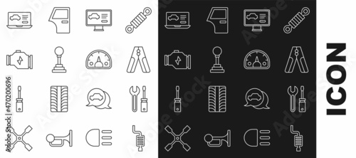 Set line Car muffler, Screwdriver and wrench spanner, battery jumper power cable, Diagnostics condition of car, Gear shifter, Check engine, and Speedometer icon. Vector
