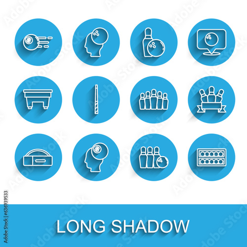 Set line Case for billiard cue, Billiard ball, Bowling pin and, balls on stand, and icon. Vector